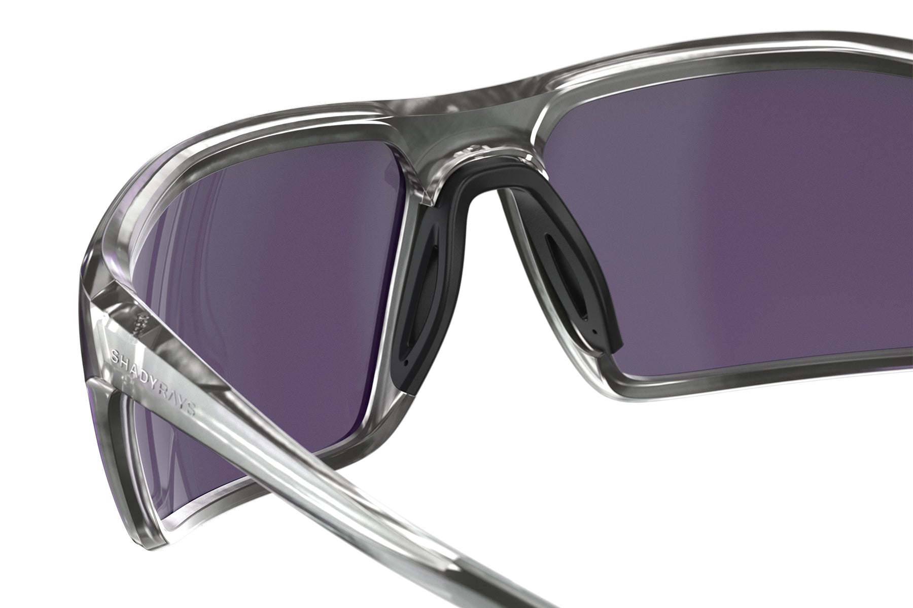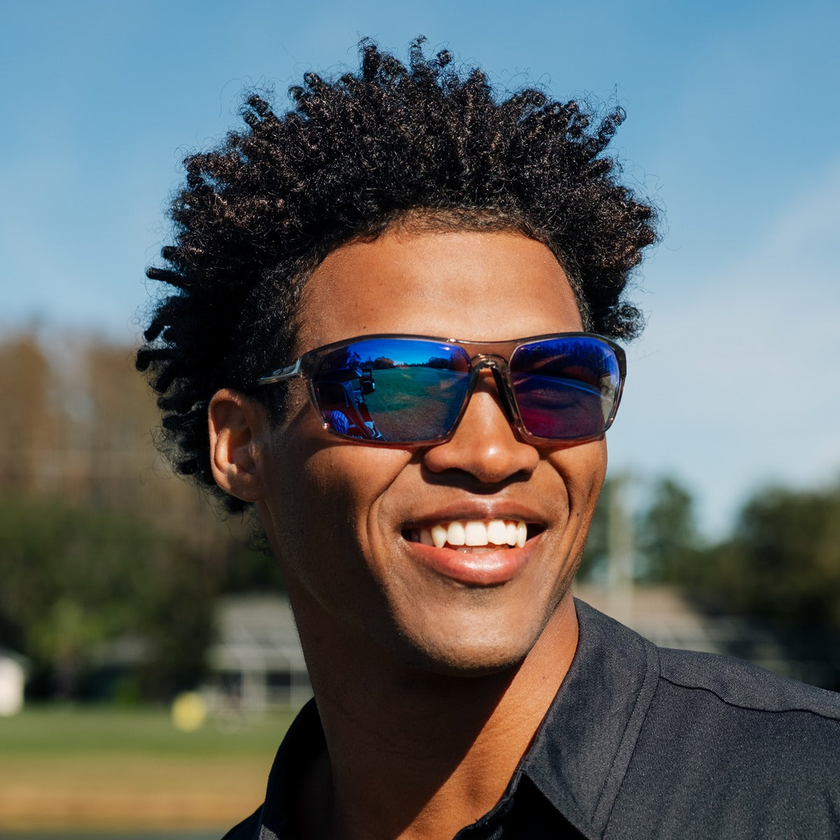 Lightweight sport wraparound design with flush mount lenses for full peripheral vision and unobstructed views.