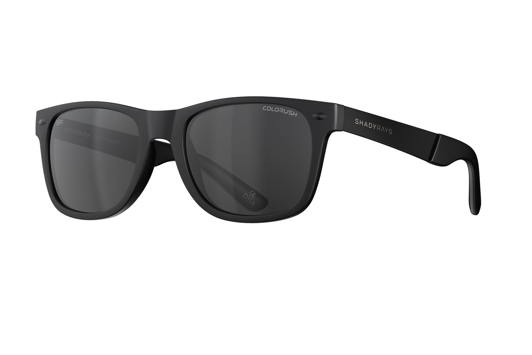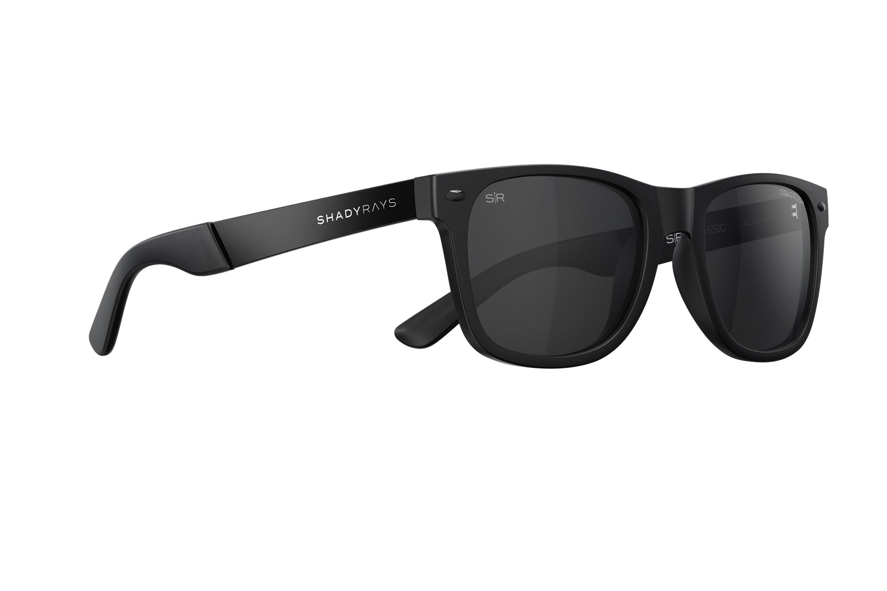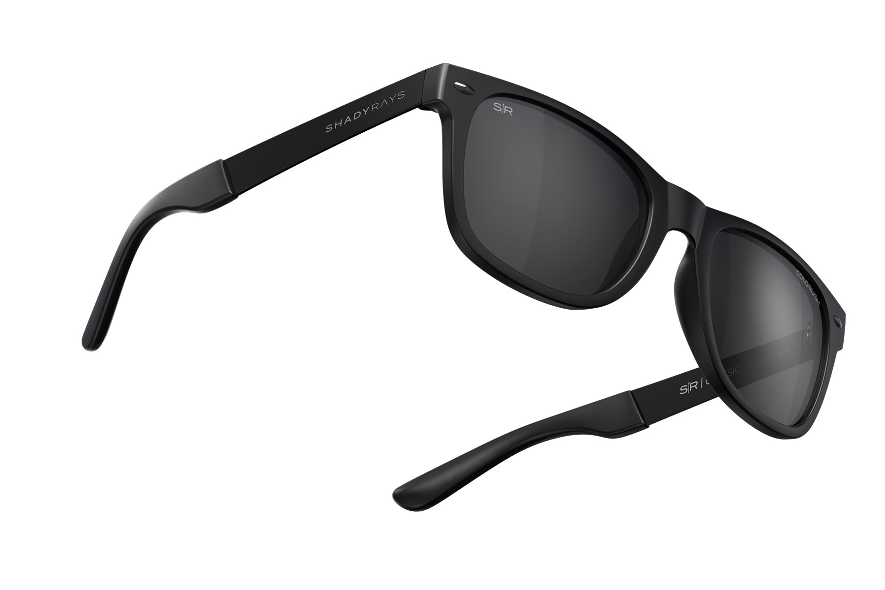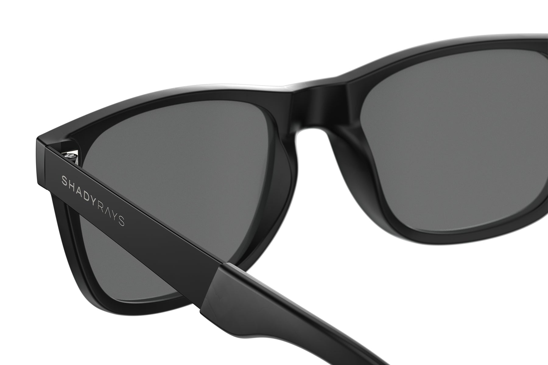 Premium brushed black stainless steel arms with etched Shady Rays logo.