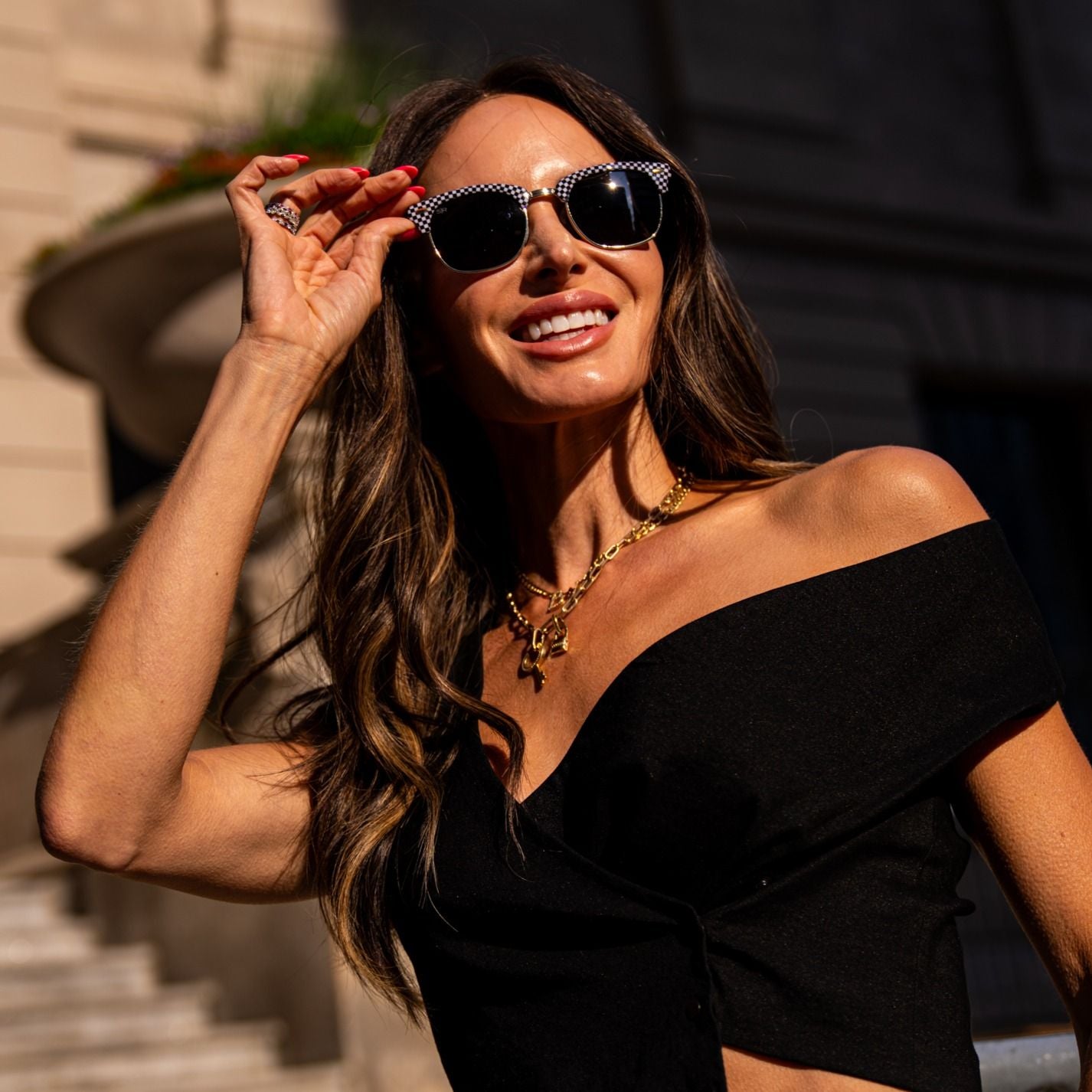 Black gloss frame with custom checkered black and white pattern, featuring metal hinges and gold accents